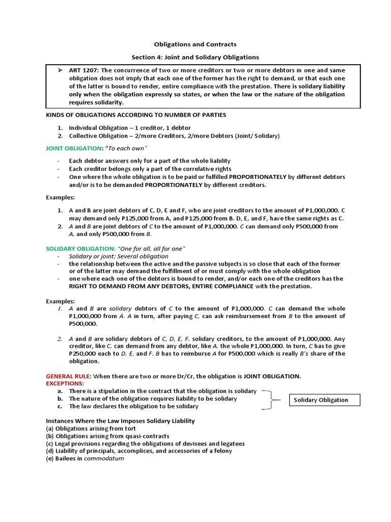 Example Of Solidary Obligation - A solidary obligation, or an obligation in solidum, is a type of obligation in the civil law jurisprudence that allows either obligors to be bound together, each liable for the whole performance, or obligees to be bound together, all owed just a single performance and each entitled to the entirety of it.. Some of the following quotes from the division of labor in society show the nature of durkheim's argument: A solidary obligation, or an obligation in solidum, is a type of obligation in the civil law jurisprudence that allows either obligors to be bound together, each liable for the whole performance, or obligees to be bound together, all owed just a single performance and each entitled to the entirety of it. (2) obligations which have for their object the accomplishment of work by metrical units (par. Feb 21, 2019 · section 6. The obligation of tristan to make a table, 3 feet wide and 5 feet long.